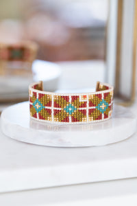 Bracelet tissé en perle de verre d'une largeur de 2 cm.